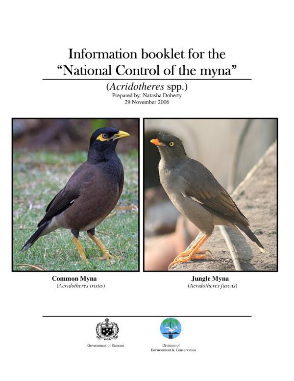 The Jungle myna (Acridotheres fuscus) was first recorded in Upolu in 1965, followed by the Common myna (Acridotheres tristis) in 1988 (Watling, 2001). It is believed they were introduced to control livestock ticks and unexpectedly became an invasive species; over the past two decades their populations have increased dramatically. They are now found throughout Samoa with high density populations concentrated in the Apia town area and neighboring villages