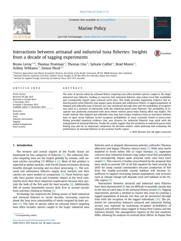 The suite of species taken by artisanal fisheries targeting tuna often includes species caught in the larger industrial tuna fisheries, leading to concerns that industrial fisheries may reduce local fish availability and consequently impact upon artisanal catch rates. This study provides supporting evidence that industrial purse seine fisheries may impact upon artisanal and subsistence fishers. A tagged population of skipjack and yellowfin tuna known size was monitored through time and the probability of recapture was used as a measure of interaction with the industrial purse seine fishing effort was higher.