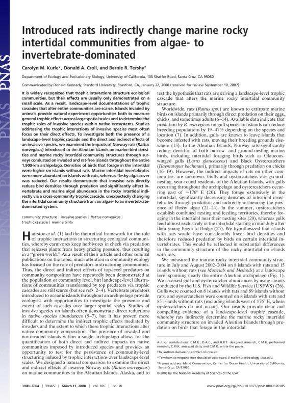 It is widely recognized that trophic interactions structure ecological communities, but their effects are usually only demonstrated on a small scale. As a result, landscape-level documentations of trophic cascades that alter entire communities are scarce. Islands invaded by animals provide natural experiment opportunities both to measure general trophic effects across large spatial scales and to etermine the trophic roles of invasive species within native ecosystems. Studies addressing the trophic interactions of invasive species most often focus on their direct effects. To investigate both the presence of a landscape-level trophic cascade and the direct and indirect effects of an invasive species, we examined the impacts of Norway rats (Rattus norvegicus) introduced to the Aleutian Islands on marine bird densities and marine rocky intertidal community structures through surveys conducted on invaded and rat-free islands throughout the entire 1,900-km archipelago. Densities of birds that forage in the intertidal were higher on islands without rats. Marine intertidal invertebrates were more abundant on islands with rats, whereas fleshy algal cover was reduced. Our results demonstrate that invasive rats directly reduce bird densities through predation and significantly affect invertebrate and marine algal abundance in the rocky intertidal indirectly via a cross-community trophic cascade, unexpectedly changing the intertidal community structure from an algae- to an invertebrate-dominated system.