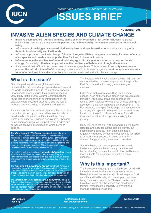 Invasive alien species (IAS) are animals, plants or other organisms that are introduced into places outside their natural range, negatively impacting native biodiveristy, ecosystem services or human well-being. IAS are one of the biggest causes of biodiversity loss and species extinctions and are also a global threat to food security and livelihoods. IAS are compounded by climate change. Climate change facilitates the spread and establishement of many alien species and creates new opportunities for them to become invasive. IAS can reduce the resilience of natural habitats, agricultural systems and urban areas to climate change. Conversely, climate change reduces the resilience of habitats to biological invasions. It is essential that IAS be incorporated in to climate change policies. This includes biosecurity measures to prevent the introduction of IAS to new regions as a result of climate change, and rapid response measures to monitor and eradicate alien species that may become invasive due to climate change.