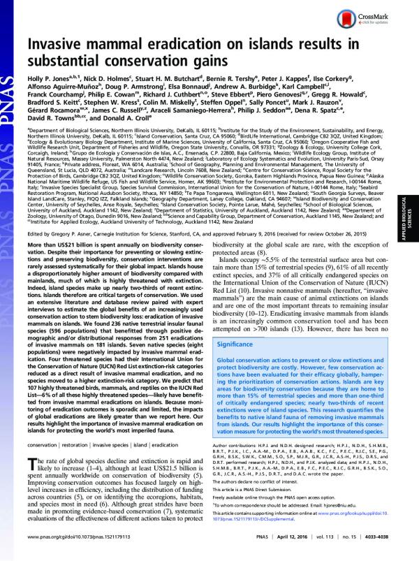 More than US$21 billion is spent annually on biodiversity conservation. Despite their importance for preventing or slowing extinctions and preserving biodiversity, conservation interventions are rarely assessed systematically for their global impact. Islands house a disproportionately higher amount of biodiversity compared with mainlands, much of which is highly threatened with extinction. Indeed, island species make up nearly two-thirds of recent extinctions. Islands therefore are critical targets of conservation. We used an extensive literature and database review paired with expert interviews to estimate the global benefits of an increasingly used conservation action to stem biodiversity loss: eradication of invasive mammals on islands. We found 236 native terrestrial insular faunal species (596 populations) that benefitted through positive demographic and/or distributional responses from 251 eradications of invasive mammals on 181 islands. Seven native species (eight populations) were negatively impacted by invasive mammal eradication. Four threatened species had their International Union for the Conservation of Nature (IUCN) Red List extinction-risk categories reduced as a direct result of invasive mammal eradication, and no species moved to a higher extinction-risk category. We predict that 107 highly threatened birds, mammals, and reptiles on the IUCN Red List6% of all these highly threatened specieslikely have benefitted from invasive mammal eradications on islands. Because monitoring of eradication outcomes is sporadic and limited, the impacts of global eradications are likely greater than we report here. Our results highlight the importance of invasive mammal eradication on islands for protecting the worlds most imperiled fauna. Record Created: 24-Apr-2018