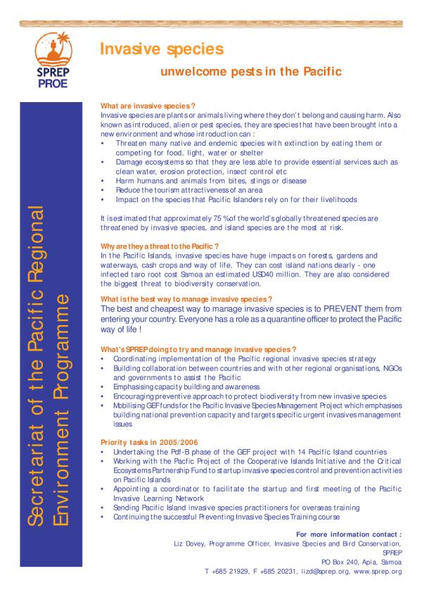 Invasive species are plants or animals living where they dont belong and causing harm. Also known as introduced, alien or pest species, they are species that have been brought into a new environment and whose introduction can : Threaten many native and endemic species with extinction by eating them or competing for food, light, water or shelter Damage ecosystems so that they are less able to provide essential services such as clean water, erosion protection, insect control etc Harm humans and animals from bites, stings or disease Reduce the tourism attractiveness of an area Impact on the species that Pacific Islanders rely on for their livelihoods