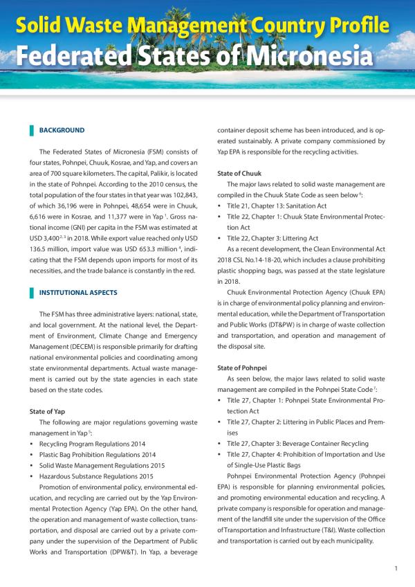 This document provides an overview of the current state of waste management in the Federated States of Micronesia. Key data from this document includes: "Volume of waste managed by waste management services in the FSM (tons/day)","Composition of Household Waste (weight base)", "Solid Waste Management Strategies", "volume of waste managed by waste management services", "Waste collection ", "waste disposal & waste recycling", "container deposit scheme recycling", "waste management laws & regulations", and "recommendations for the improvement of Solid Waste Management in the Federated States of Micronesia. All data was compiled by JICA/JPRISM experts with the help of colleagues from Federated States of Micronesia.