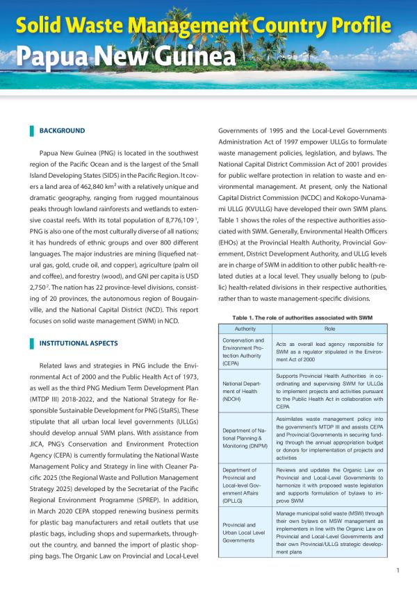 This document provides an overview of the current state of waste management in Papua New Guinea. Key data from this document includes: "household waste generation and composition in Port Moresby", "Waste collection fees and tipping fees in NCDC", "waste disposal & waste recycling", "waste management policies & Acts", and "recommendations for the improvement of Solid Waste Management in the Pacific Island countries". All data was compiled by JICA/JPRISM experts with the help of colleagues from Papua New Guinea.
