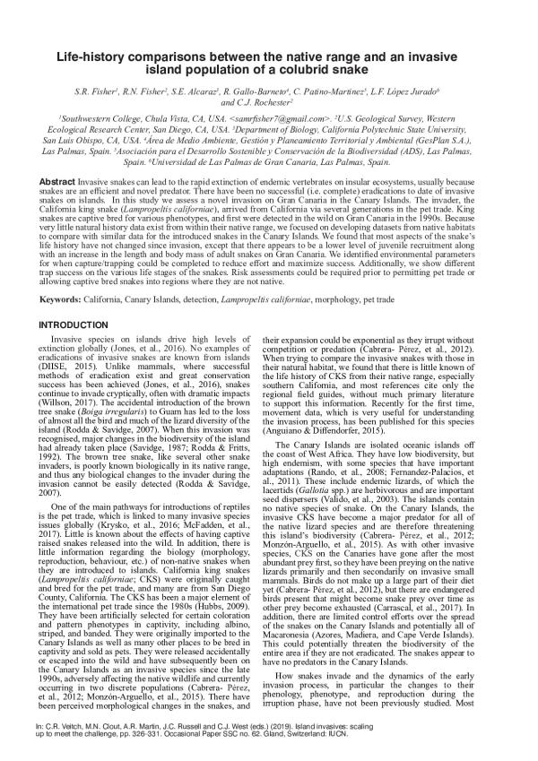 Invasive snakes can lead to the rapid extinction of endemic vertebrates on insular ecosystems, usually because snakes are an efficient and novel predator. There have been no successful (i.e. complete) eradications to date of invasive snakes on islands. In this study we assess a novel invasion on Gran Canaria in the Canary Islands. The invader, the California king snake (Lampropeltis californiae), arrived from California via several generations in the pet trade. King snakes are captive bred for various phenotypes, and first were detected in the wild on Gran Canaria in the 1990s. Because very little natural history data exist from within their native range, we focused on developing datasets from native habitats to compare with similar data for the introduced snakes in the Canary Islands. We found that most aspects of the snakes life history have not changed since invasion, except that there appears to be a lower level of juvenile recruitment along with an increase in the length and body mass of adult snakes on Gran Canaria. We identified environmental parameters for when capture/trapping could be completed to reduce eff ort and maximize success. Additionally, we show different trap success on the various life stages of the snakes. Risk assessments could be required prior to permitting pet trade or allowing captive bred snakes into regions where they are not native.