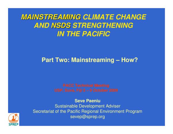PACC Technical Meeting Oct09MAINSTREAMINGMAINSTREAMING CLIMATE CHANGE AND NSDSNSDS STRENGTHENING IN THE PACIFIC PACC Technical Meeting USP, Suva, Fiji 5 â 9 October 2009 Seve Paeniu Sustainable Development Adviser Secretariat of the Pacific Regional Environment Program sevep@sprep.org Part Two: Mainstreaming â How?Outline 1. Practical aspects of mainstreaming 2. A suggested methodology 3. Tools for SD planning 4. Examples of mainstreaming experiences 5. Conclusion1. Practical aspects of Mainstreaming Mainstreaming framework has 3 key interlinked elements: 1 NSDS (more than plan) strengthening 2 Sector planning â e.g. NAPA, climate change policy, sector strategies & plans 3 Medium term fiscal management linked to annual budget allocationFramework for strengthening NSDS VISION NATIONAL PRIORITIES & KEY OUTCOME TARGETS National planning & prioritisation process SECTOR AND CROSS CUTTING STRATEGYS AND PRIORITISED ACTION PLANS e.g. ENERGY NBSAP CLIMATE CHANGE CORE SOCIETAL VALUES GUIDING P