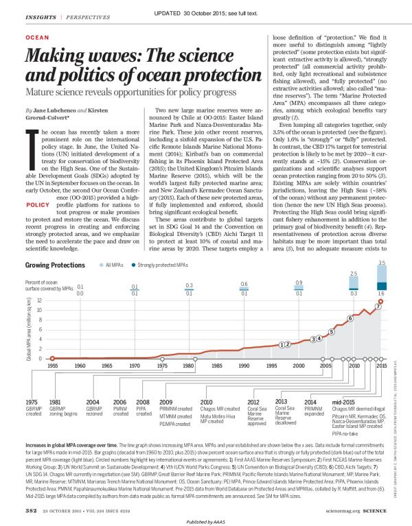 The ocean has recently taken a more prominent role on the international policy stage. In June, the United Nations (UN) initiated development of a treaty for conservation of biodiversity on the High Seas. One of the Sustainable Development Goals (SDGs) adopted by the UN in September focuses on the ocean. In early October, the second Our Ocean Conference (OO-2015) provided a high profile platform for nations to tout progress or make promises to protect and restore the ocean. We discuss recent progress in creating and enforcing strongly protected areas, and we emphasize the need to accelerate the pace and draw on scientific knowledge