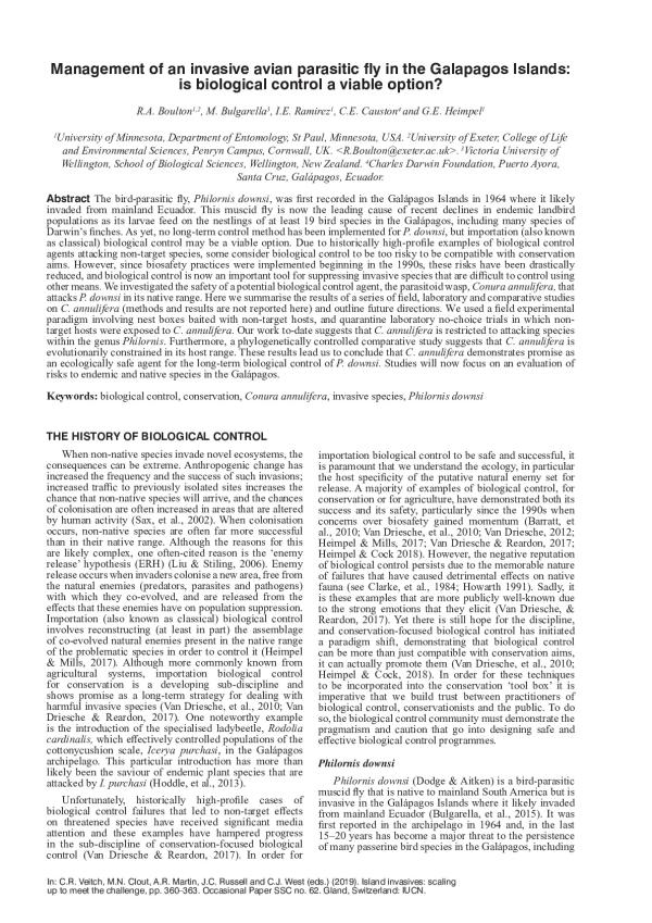 The bird-parasitic ?y, Philornis downsi, was ?rst recorded in the Galápagos Islands in 1964 where it likely invaded from mainland Ecuador. This muscid ?y is now the leading cause of recent declines in endemic landbird populations as its larvae feed on the nestlings of at least 19 bird species in the Galápagos, including many species of Darwins ?nches. As yet, no long-term control method has been implemented for P. downsi, but importation (also known as classical) biological control may be a viable option. Due to historically high-pro?le examples of biological control agents attacking non-target species, some consider biological control to be too risky to be compatible with conservation aims. However, since biosafety practices were implemented beginning in the 1990s, these risks have been drastically reduced, and biological control is now an important tool for suppressing invasive species that are di?cult to control using other means. We investigated the safety of a potential biological control agent, the parasitoid wasp, Conura annulifera, that attacks P. downsi in its native range. Here we summarise the results of a series of ?eld, laboratory and comparative studies on C. annulifera (methods and results are not reported here) and outline future directions. We used a ?eld experimental paradigm involving nest boxes baited with non-target hosts, and quarantine laboratory no-choice trials in which non-target hosts were exposed to C. annulifera. Our work to-date suggests that C. annulifera is restricted to attacking species within the genus Philornis. Furthermore, a phylogenetically controlled comparative study suggests that C. annulifera is evolutionarily constrained in its host range. These results lead us to conclude that C. annulifera demonstrates promise as an ecologically safe agent for the long-term biological control of P. downsi. Studies will now focus on an evaluation of risks to endemic and native species in the Galápagos.