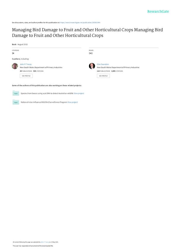 This book promotes the adoption of a more strategic approach to bird management including use of better techniques to bird management including use of better techniques ti reduce damage and increased cooperation between neighbours. Improved collaboration and commitment from industry and government is also essential along with reconciliation of legislation and responsibilities. Whilst the focus of this review is pest bird impacts on horticulture, most of the issues are of relevance to pest bird management in general.