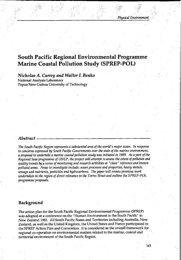 This paper reviews work previously undertaken in the region of direct relevance tp the Torres Straight and outlines the SPREP POL programmes and proposals