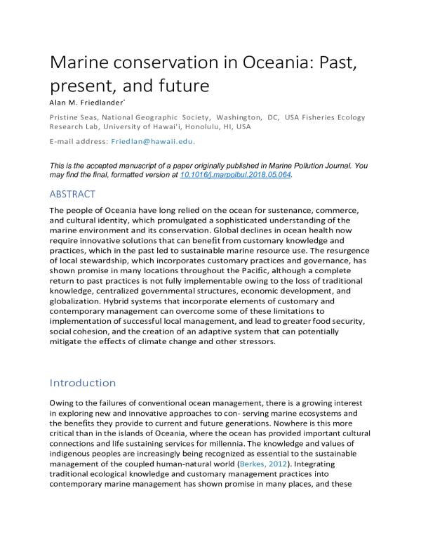 The people of Oceania have long relied on the ocean for sustenance, commerce, and cultural identity, which promulgated a sophisticated understanding of the marine environment and its conservation. Global declines in ocean health now require innovative solutions that can benefit from customary knowledge and practices, which in the past led to sustainable marine resource use.