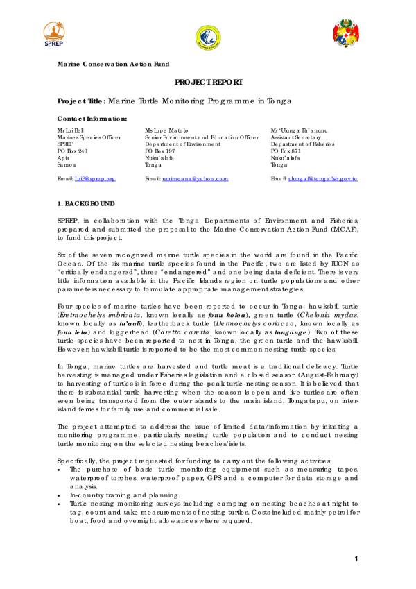 The survey forms used to record data and information for turtle track/nests and nesting turtle surveys were developed before the start of the project. These forms were further refined in consultation with the Tonga Departments concerned during the in-country training prior to the conduct of the initial surveys. In addition to forms for recording data, guidelines were also developed to help in the conduct of the surveys and in marine turtle species identification.