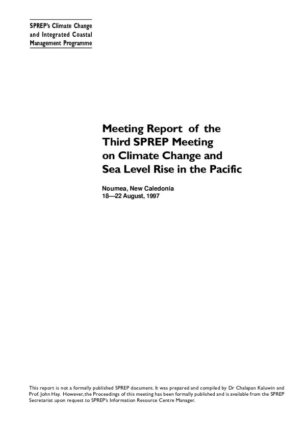 Mitigation prelimsSPREPâs Climate Change and Integrated Coastal Management Programme This report is not a formally published SPREP document. It was prepared and compiled by Dr Chalapan Kaluwin and Prof. John Hay. However, the Proceedings of this meeting has been formally published and is available from the SPREP Secretariat upon request to SPREPâs Information Resource Centre Manager. Meeting Report of the Third SPREP Meeting on Climate Change and Sea Level Rise in the Pacific Noumea, New Caledonia 18â22 August, 1997ii Contents Chairpersons Summary of Findings and Future Needs .................................................................................... iii 1. At the National Level .............................................................................................................................................................. v 2. At the Regional Level ....................................................................................................................................
