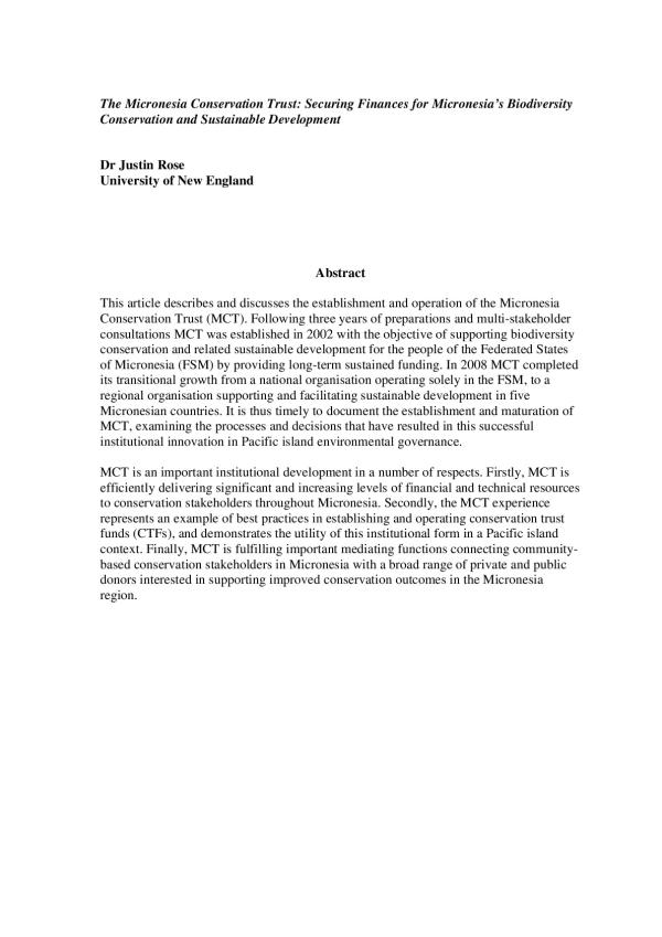 This article describes and discusses the establishment and operation of the Micronesia Conservation Trust (MCT). Following three years of preparations and multi-stakeholder consultations MCT was established in 2002 with the objective of supporting biodiversity conservation and related sustainable development for the people of the Federated States of Micronesia (FSM) by providing long-term sustained funding. In 2008 MCT completed its transitional growth from a national organisation operating solely in the FSM. to a regional organisation supporting and facilitating sustainable development in five Micronesian countries. It is thus timely to document the establishment and maturation of MCT, examining the processes and decisions that have resulted in this successful institutional innovation in Pacific island environmental governance.
