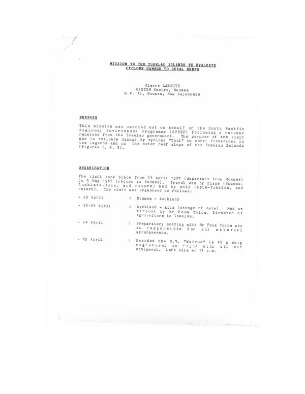 Mr Foua Toloa possesses a diving certificate and accompanied me on seven of the ten diving inspections made. Mr Foua is not authorised to go deeper than 25 to 30 m, so when it was necessary to go down deeper I went alone. The air bottles we used had a capacity of only about two cubic metres and it was therefore impossible to stay for very long at each depth described. For this reason the descriptions given hereafter are very rough and the percentages only approximate