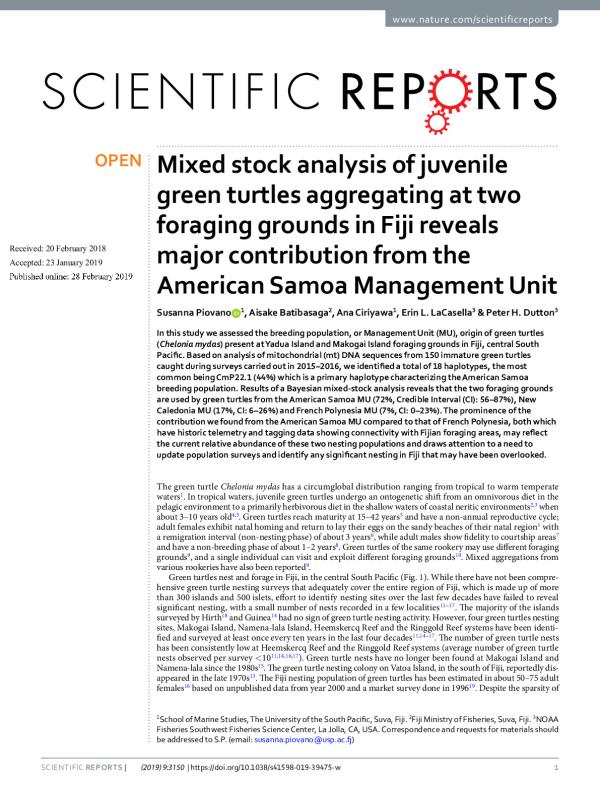 The aim of this study was to assess the stock composition of green turtle aggregations at Yadua Island and Makogai Island foraging grounds by using molecular markers (mtDNA) on samples from wild ranging individuals captured and released in situ.