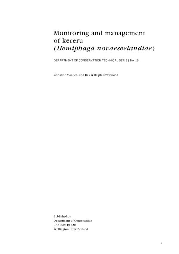 The endemic kereru (Hemiphaga novaeseelandiae) (also known as kuku, kukupa or New Zealand pigeon, but henceforth referred to as kereru) and the Chatham Island subspecies, parea (Hemiphaga novaeseelandiae chathamensis), are the only extant representatives of the genus Hemiphaga. A programme has been set up to monitor kereru populations. The aim of this monitoring programme is to provide a clearer picture of medium- to long-term trends in kereru populations at key sites (e.g., mainland island management sites and their paired non-treatment sites), and to document the responses of kereru populations to management actions. This report sets out the requirements for monitoring kereru at key sites as part of a national programme. In addition, it is intended to be used as a practical guide for anyone (e.g., iwi, conservation groups, school groups) planning to initiate a kereru monitoring project. The most efficient way of detecting and interpreting kereru population trends is considered to be by undertaking 5-minute counts with distance estimates in conjunction with phenology monitoring and display flight monitoring. It is therefore recommended that others use these methods wherever possible. A section on other techniques is included to cover situations where 5-minute counts may not be practicable. Wherever possible, kereru monitoring should be integrated into existing Department of Conservation bird monitoring and management programmes, rather than requiring the initiation of new projects. Iwi, conservation groups and interested members of the public will be encouraged to participate in kereru monitoring and conservation management. Annual results from each site should be forwarded to the programme co-ordinator, who will review and collate the data, and prepare an annual report for distribution to all participants and interested parties. Explanation of the programme, relevant aspects of kereru ecology, and background information are provided in the main text. Descriptions of the actual methods are given in the appendices.