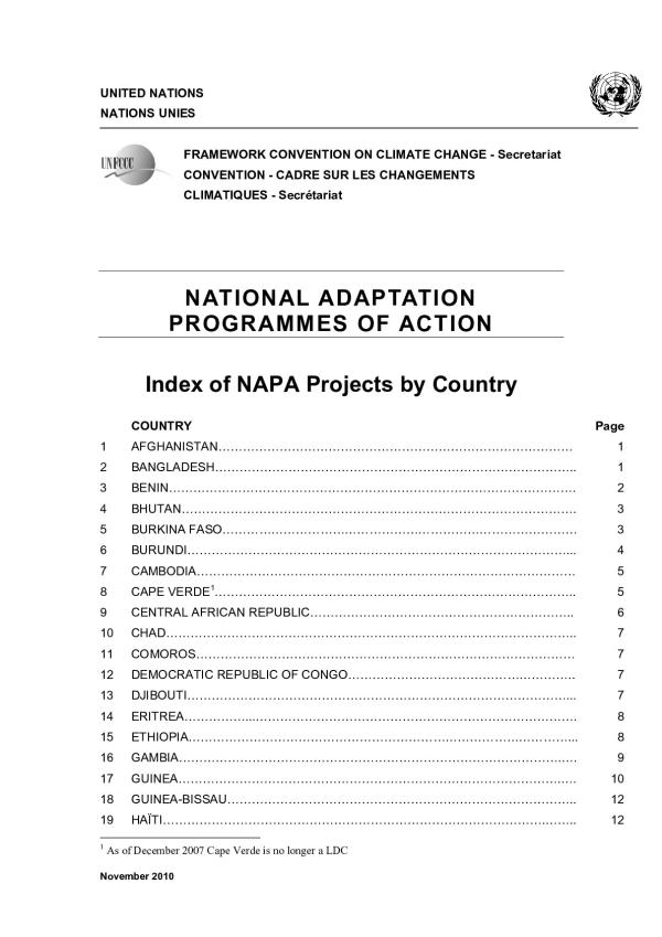 untitledNovember 2010 UNITED NATIONS NATIONS UNIES FRAMEWORK CONVENTION ON CLIMATE CHANGE - Secretariat CONVENTION - CADRE SUR LES CHANGEMENTS CLIMATIQUES - Secrétariat NATIONAL ADAPTATION PROGRAMMES OF ACTION Index of NAPA Projects by Country COUNTRY Page 1 AFGHANISTAN����������������������������� 1 2 BANGLADESH�����������������������������.. 1 3 BENIN���������������������������������. 2 4 BHUTAN��������������������������������. 3 5 BURKINA FASO����������������������������� 3 6 BURUNDI�������������������������������... 4 7 CAMBODIA�������������������������������
