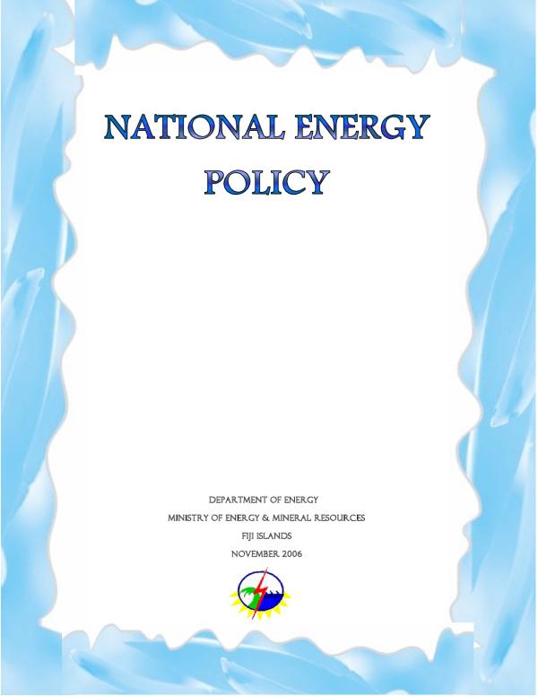 Department Of Energy Ministry Of Energy & Mineral Resources Fiji Islands November 2006 Department Of Energy Ministry Of Energy & Mineral Resources Fiji Islands November 2006 November 2006 Logo Mast Head DEPARTMENT OF ENERGY 26 The National Energy Policy (NEP) provides a common framework for all (both public and private) associated with the energy sector to work towards for optimum utilization of energy resources for the overall growth and development of the economy over the next five years. The NEP is closely aligned to the National Strategic Development Plan (2007 â 2011). There are four key strategic areas that the NEP focuses on: [i] National Energy Planning Energy planning covers four broad areas of institutional strengthening of the Department of Energy, development and