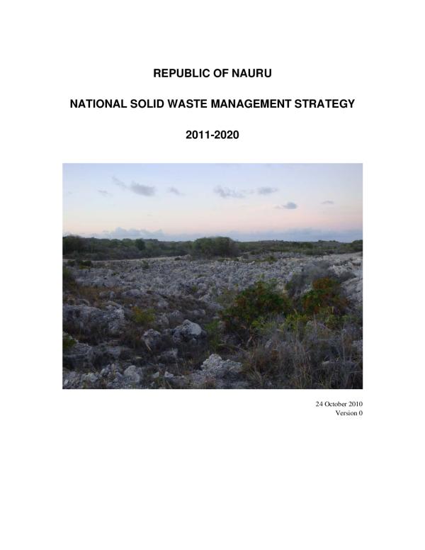 Nauru faces many economic and environmental challenges. In the 1970s the country experienced an economic boom due to phosphate mining, however, because of mismanagement of the revenue, the country currently has limited financial resources to undertake many of its development programmes including environmentally sound waste management. In the face of a range of environmental, social and economic threats from poor waste management and pollution, and in the context of the limited resources, this National Solid Waste Management Strategy is developed as a matter of priority. The proposed way forward is based on an analysis of the existing situation and was developed using a participatory and consultative approach through workshops held in November 2008 and October 2010.