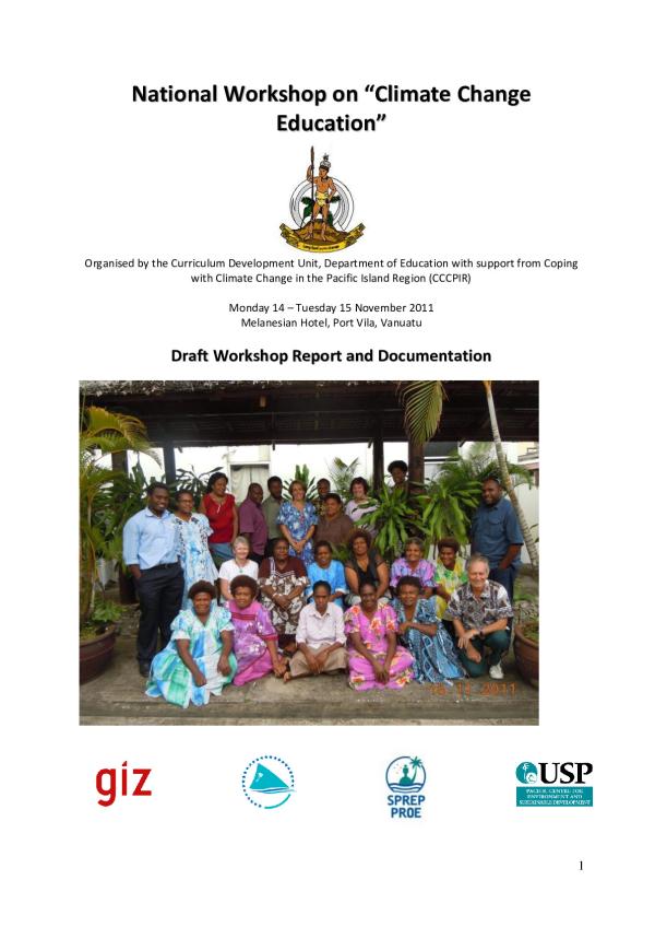 On November 14 to 15 2011 a two day workshop on climate change (CC) education and disaster risk reduction (DRR) for curriculum writers for Kindergarten to year 6 (K -6)and the Vanuatu National Training Council took place at the Melanesia Hotel in Port Vila, Vanuatu. The workshops aim was to enable curriculum writers (formal and non formal) for K-6 to develop learning outcomes (including knowledge, skills and attitudes) on climate change and disaster risk reduction and options for mitigation and adaptation in Vanuatu (Agenda see Annex I).