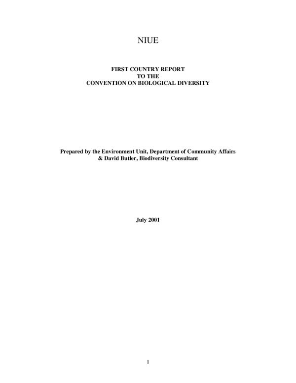 This First Country Report to the Conference of the Parties for Niue is being submitted around the same time as the National Biodiversity Strategy and Action Plan (NBSAP) and 2nd Country Report, to complete the outputs under a UNDP-funded Enabling Activities project. Given its timing it has been decided to format this First Country Report according to the headings used for the Synthesis of Information contained in National Reports... (UNEP/CBD/COP/4/11/Rev.1). More detailed information is available in the NBSAP.