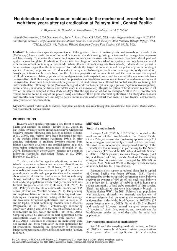 Invasive alien species represent one of the greatest threats to native plants and animals on islands. Rats (Rattus spp.) have invaded most of the worlds oceanic islands, causing lasting or irreversible damage to ecosystems and biodiversity. To counter this threat, techniques to eradicate invasive rats from islands have been developed and applied across the globe. Eradication of alien rats from large or complex island ecosystems has only been successful with the use of bait containing a rodenticide. While effective at eradicating rats from islands, rodenticide can persist in the ecosystem longer than the time required to eradicate the target rat population and can potentially harm non-target species. However, the persistence of rodenticides in ecosystems following rat eradication campaigns is poorly understood, though predictions can be made based on the chemical properties of the rodenticide and the environment it is applied in. Brodifacoum, a relatively persistent second-generation anticoagulant, was used to successfully eradicate rats from Palmyra Atoll. With this study, we evaluated the persistence of brodifacoum residues in terrestrial and marine species at Palmyra Atoll (Northern Line Islands) three years after rat eradication. We collected 44 pooled samples containing 121 individuals of the following: mullet (Moolgarda engeli), cockroaches (Periplaneta sp.), geckos (Lepidodactylus lugubris), hermit crabs (Coenobita perlatus), and fiddler crabs (Uca tetragonon). Despite detection of brodifacoum residue in all five of the species sampled in this study 60 days after the application of bait to Palmyra Atoll in 2011, brodifacoum residue was not found in any of the pooled samples collected three years after bait application. Our study demonstrates how brodifacoum residues are unlikely to persist in the marine and terrestrial food web, in a wet tropical environment, three years after rat eradication.