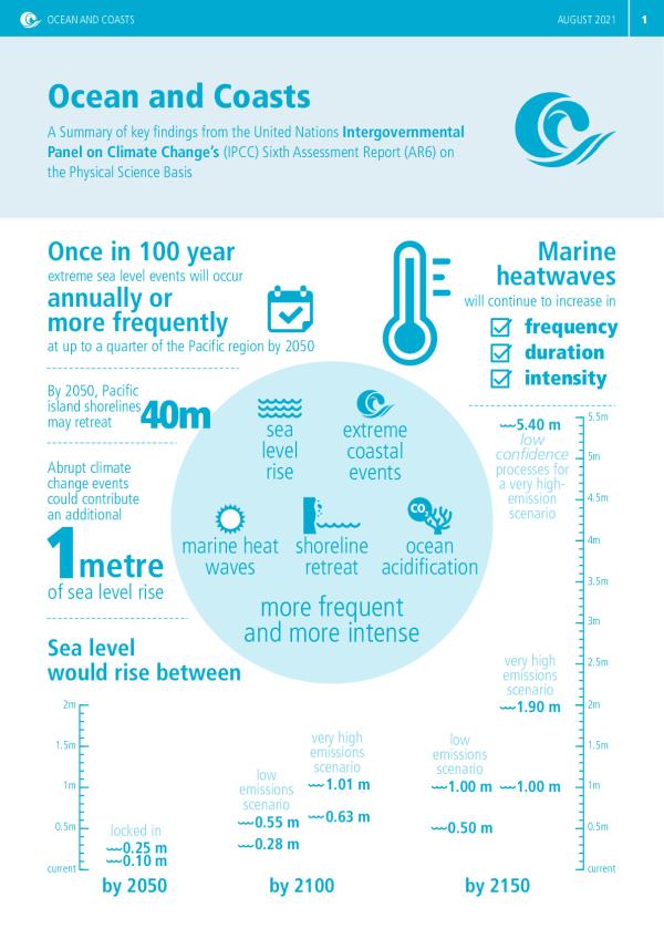 A summary of key findings from the United Nations Intergovernmental Panel of Climate Change's (IPCC) Sixth Assessment Report (AR6) on the Physical Science Basis. Sea level rise, extreme coastal events, marine heatwaves, shoreline retreat and ocean acidification are expected to become more frequent and intense that previously anticipated by IPCC estimates throughout the Pacific
