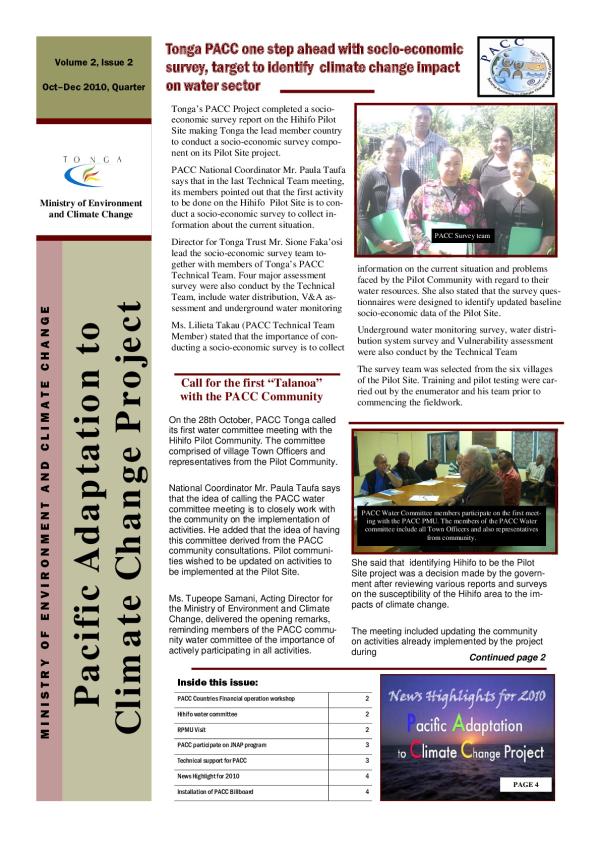 Tongaâs PACC Project completed a socio- economic survey report on the Hihifo Pilot Site making Tonga the lead member country to conduct a socio-economic survey compo- nent on its Pilot Site project. PACC National Coordinator Mr. Paula Taufa says that in the last Technical Team meeting, its members pointed out that the first activity to be done on the Hihifo Pilot Site is to con- duct a socio-economic survey to collect in- formation about the current situation. Director for Tonga Trust Mr. Sione Fakaâosi lead the socio-economic survey team to- gether with members of Tongaâs PACC Technical Team. Four major assessment survey were also conduct by the Technical Team, include water distribution, V&A as- sessment and underground water monitoring Ms. Lilieta Takau (PACC Technical Team Member) stated that the importance of con- ducting a socio-economic survey is to collect Tonga PACC one step ahead with socio-economic survey, target to identify climate change impact on water sector Call for