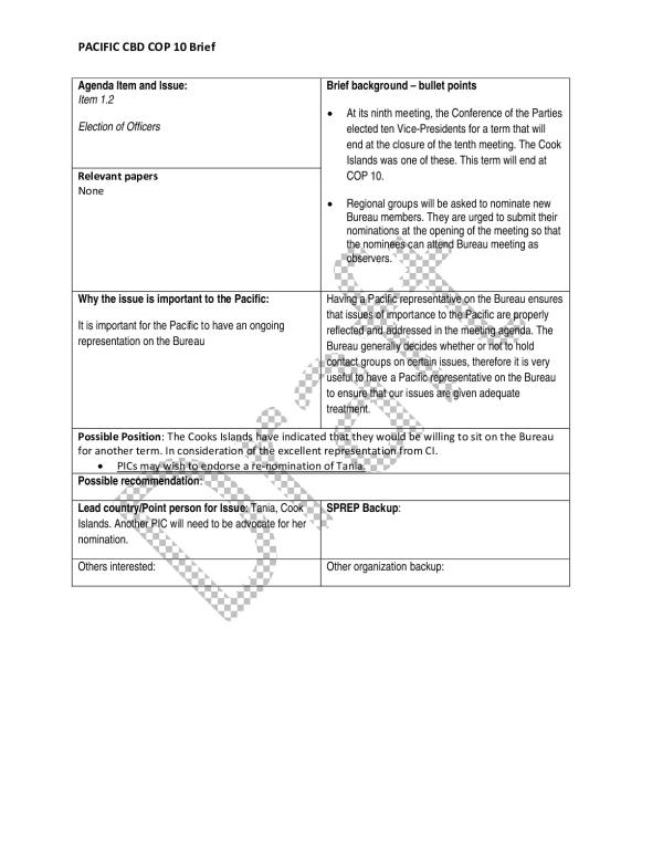 Microsoft Word - PACIFIC CBD COP BRIEF 1 _2_PACIFIC CBD COP 10 Brief  Agenda Item and Issue: Item 1.2 Election of Officers Brief background â bullet points ⢠At its ninth meeting, the Conference of the Parties elected ten Vice-Presidents for a term that will end at the closure of the tenth meeting. The Cook Islands was one of these. This term will end at COP 10. ⢠Regional groups will be asked to nominate new Bureau members. They are urged to submit their nominations at the opening of the meeting so that the nominees can attend Bureau meeting as observers. Relevant papers None Why the issue is important to the Pacific: It is important for the Pacific to have an ongoing representation on the Bureau Having a Pacific representative on the Bureau ensures that issues of importance to the Pacific are properly reflected and addressed in the meeting agenda. The Bureau generally decides whether or not to hold contact groups on certain issues, therefore it is very usef