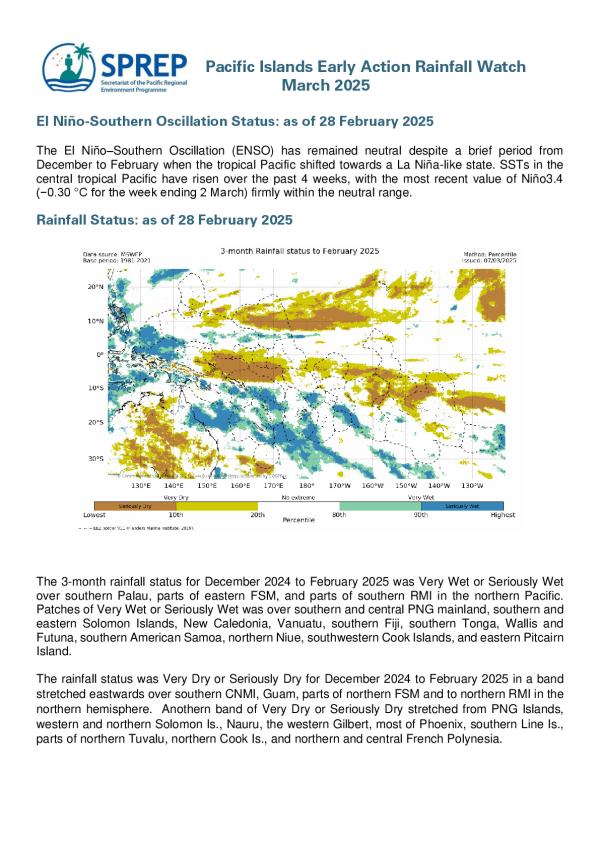 The El Niño–Southern Oscillation (ENSO) has remained neutral despite a brief period from December to February when the tropical Pacific shifted towards a La Niña-like state. SSTs in the central tropical Pacific have risen over the past 4 weeks, with the most recent value of Niño3.4 (−0.30 °C for the week ending 2 March) firmly within the neutral range