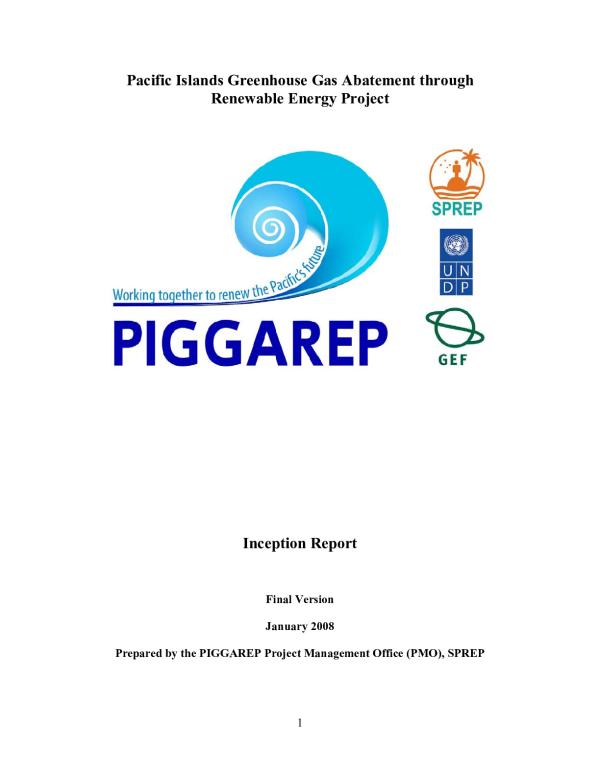 Microsoft Word - Final Inception Report_140208.doc 1 Pacific Islands Greenhouse Gas Abatement through Renewable Energy Project Inception Report Final Version January 2008 Prepared by the PIGGAREP Project Management Office (PMO), SPREP 2 TABLE OF CONTENTS TITLE PAGE 1. INTRODUCTION 4 2. BACKGROUND 4 3. COMMENCEMENT OF THE PIGGAREP 5 4. TIMELINE OF MILESTONES 5 5. INCEPTION PHASE REVIEW 5 5a) REVIEW OF THE PROJECT INSTITUTIONAL ARRANGEMENTS 6 5ai: Project Management Office (PMO) 7 5aii. Country Team 7 5aiii. Project Advisory Committee (PAC) 8 5aiv. Project Steering Committee (PSC) 9 5av. Project Coordinators 9 5b) REVIEW OF THE ROLE AND RESPONSIBILITY OF VARIOUS PARTICIPANTS FOR ACHIEVING THE PROJECT OUTCOMES 11 5c) REVIEW OF THE PROJECT MANAGEMENT ARRANGEMENTS (ORGANIZATIONAL CHART) 12 5d) REVIEW OF THE M & E FRAMEWORK FOR THE IMPLEMENTATION OF THE PROJECT 12 5e) COORDINATE ALL CO-FINANCING SOURCES WITH