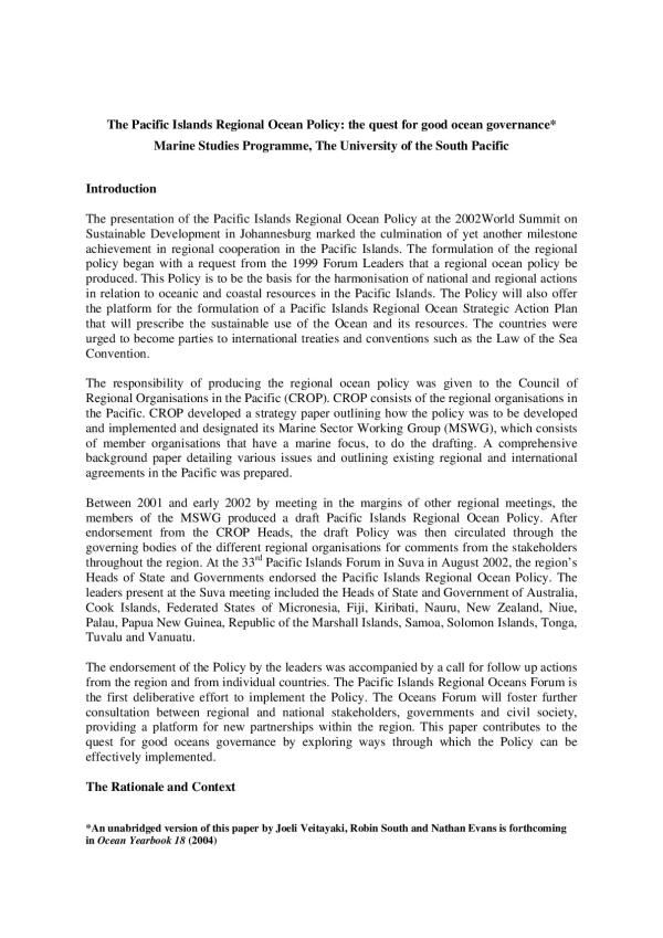 The presentation of the Pacific Islands Regional Ocean Policy at the 2002World Summit on Sustainable Development in Johannesburg marked the culmination of yet another milestone achievement in regional cooperation in the Pacific Islands. The formulation of the regional policy began with a request from the 1999 Forum Leaders that a regional ocean policy be produced. This Policy is to be the basis for the harmonisation of national and regional actions in relation to oceanic and coastal resources in the Pacific Islands. The Policy will also offer the platform for the formulation of a Pacific Islands Regional Ocean Strategic Action Plan that will prescribe the sustainable use of the Ocean and its resources. The countries were urged to become parties to international treaties and conventions such as the Law of the Sea Convention.