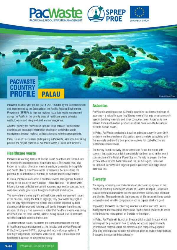 PACWASTE COUNTRY PROFILEPALAU PacWaste is a four year project (2014â2017) funded by the European Union and implemented by the Secretariat of the Pacific Regional Environment Programme (SPREP), to improve regional hazardous waste management across the Pacific in the priority areas of healthcare waste, asbestos waste, E-waste and integrated atoll waste management. A further priority for PacWaste is to foster links between Pacific island countries and encourage information sharing on sustainable waste management through regional collaboration and twinning arrangements. Palau is one of 15 countries participating in PacWaste, with activities taking place in the project domains of healthcare waste, E-waste and asbestos. Healthcare waste PacWaste is working across 14 Pacific island countries and Timor-Leste to improve the management of healthcare waste. This waste type, also known as hospital, clinical or medical waste, is generated by hospitals and health clinics. Healthcare waste is hazardous because
