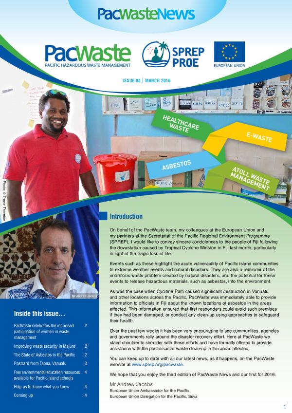PacWaste News Issue 3 on Pacific Healthcare, e-waste, asbestos waste management and atoll waste management updates and latest events in the Pacific.