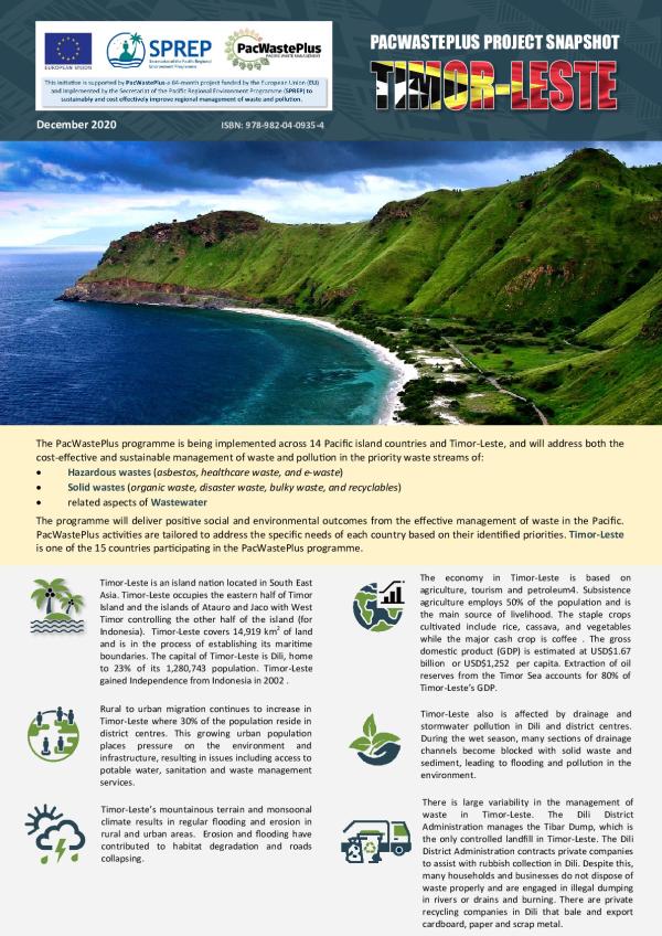 Timor-Leste is an island nation located in South East Asia. Timor-Leste occupies the eastern half of Timor Island and the islands of Atauro and Jaco with West Timor controlling the other half of the island (for Indonesia). Timor-Leste covers 14,919 km2 of land and is in the process of establishing its maritime boundaries. The capital of Timor-Leste is Dili, home to 23% of its 1,280,743 population. Timor-Leste gained Independence from Indonesia in 2002 .