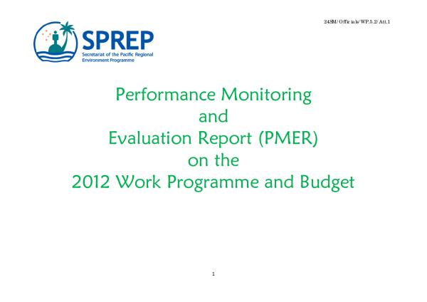 The Performance Monitoring and Evaluation Report (PMER) is submitted annually by the Secretariat to the members and the SPREP Meeting (SM) in fulfilment of the Directors obligation under the SM Rules of Procedure to provide a summary of the Secretariats work progress and achievements of specific work targets throughout the year. The format for the 2012 PMER report has changed to reflect the new SPREP Strategic Plan for 2011-2015 which replaced the previous Action Plan of 2005-2009 and the Strategic Programmes 2004-2013. The 2012 PMER will therefore be the first to be presented under the new SPREP Strategic Plan 2011-2015. For 2012, Performance is measured against targets established in the 2012 Work Programme and Budget, reflecting the Member priorities under the new SPREP Strategic Plan.