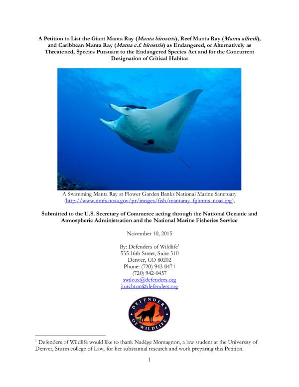 Petitioner Defenders of Wildlife (Defenders) is dedicated to the protection of all native animals and plants in their natural communities. With more than 1.2 million members, supporters, and activists, Defenders is a leading advocate for the protection of threatened and endangered species. Defenders 2013-2023 Strategic Plan identifies sharks and other elasmobranchs as one of several categories of key species whose conservation is a priority for our organizations work