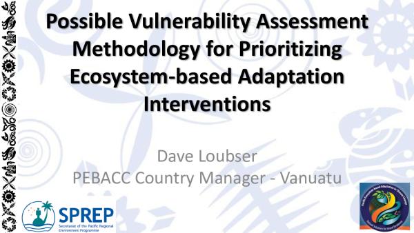 PowerPoint PresentationPossible Vulnerability Assessment Methodology for Prioritizing Ecosystem-based Adaptation Interventions Dave Loubser PEBACC Country Manager - Vanuatu Ecosystem and Socio-economic Resilience Analysis and Mapping ⢠ESRAM Process: â to inform the identification of ecosystem-based management options for strengthening resilience to the impacts of climate change and other environmental stressors by assessing vulnerabilites and opportunities. 2 3 Ecosystem and Socio-economic Resilience Analysis and Mapping Habitat Stability to Climate Change ⢠Use various climate variables â What is available â What do you believe is important ⢠Can use a variety of proxys for habitat â Land Cover â Vegetation â Biome 4 Habitat Stability to Climate Change 5 Biome/Habitat/Vegetation Model Predicted changes in habitats based on predicted climate envelopes Habitat Change Prediction habitat stability ⢠Flood Attenuation ⢠Stream flow Augmentation ⢠Eros