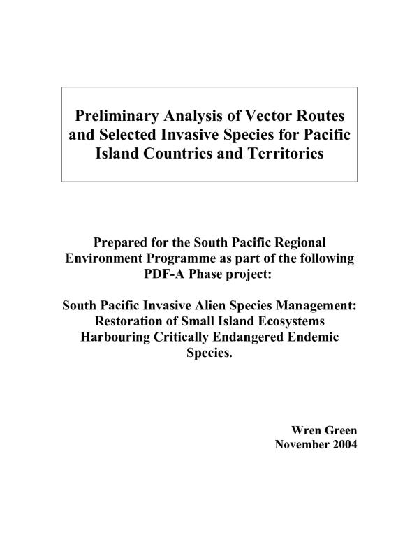 Understanding vector routes for invasive species (i.e. the routes by which pest plants and animals move from place to place via human assistance) is a key element in global and national efforts to reduce risks and limit the further spread of invasive species. This report is divided into two main sections. The first section provides a quantitative analysis of air and sea movements between the countries and territories of the Pacific. The second section summarises information on eighty existing or potential invasive plants and animals to Pacific islands. While the GEF project with which this report is linked is limited to SPREP countries, the analysis also includes the territories of the region (with the exception of Pitcairn Island). This is essential since some territories are pivotal to understanding vector routes and transport hubs in the region. For the same reason, flights from Pacific islands to Hawaii are included, as well as including Hawaii in the analysis of the selected invasive species. There is significant variability in the volume and patterns of ship movements and aircraft flights between the countries and territories of the Pacific, which is consistent with their diverse sizes, economies, exports, and political linkages. A few countries emerged as significant hubs for sea and air transport within the region. (Refer to Tables 1 and 2 for summaries.) In the northern Pacific, Guam emerges as the high risk country, given its high levels of total merchant ship and oceanic fishing vessels as well as the largest number of weekly flights to other Pacific island countries (139) and to Asian destinations (148). In the central southern Pacific, Fiji is the major transport centre with a large volume of merchant shipping, cruise liners and itinerant yachts (585 yearly visits) and relatively high numbers of weekly flights both within and outside the region. To the east, French Polynesia has a smaller annual number of merchant ship visits, but when other shipping activity is included, as well as 26 weekly flights to the USA (including Hawaii) and more within the region, it emerges as an important vector route. (It already has a significant number of invasive species). Papua New Guinea and New Caledonia are important countries in the western Pacific for shipping volumes; New Caledonia also for visits by yachts (500/yr). Papua New Guinea has extensive air links with Australia, another source of tropical invasives, but very few within the Pacific. New Caledonia has a larger number of weekly flights than Papua New Guinea spread within the region, as well as to Asian, Australian and New Zealand destinations. The information in the second section on eighty invasive species provides evidence for the links between trade, travel and the distribution of invasives. Vector routes and methods of spread are identified. It also highlights the importance of early detection and eradication if Pacific countries are to be more effective at limiting the arrival and spread of invasive species.