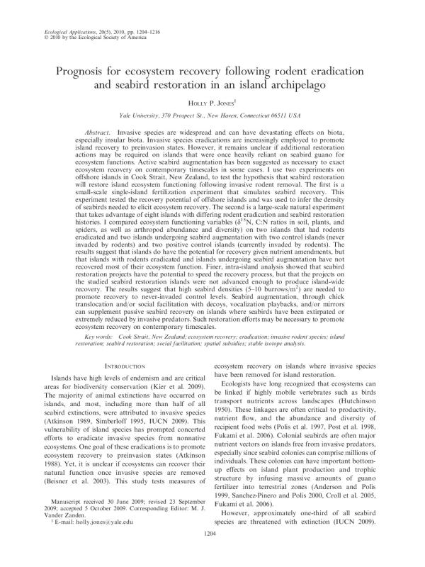 Invasive species are widespread and can have devastating effects on biota, especially insular biota. Invasive species eradications are increasingly employed to promote island recovery to preinvasion states. However, it remains unclear if additional restoration actions may be required on islands that were once heavily reliant on seabird guano for ecosystem functions. Active seabird augmentation has been suggested as necessary to exact ecosystem recovery on contemporary timescales in some cases. I use two experiments on offshore islands in Cook Strait, New Zealand, to test the hypothesis that seabird restoration will restore island ecosystem functioning following invasive rodent removal. The first is a small-scale single-island fertilization experiment that simulates seabird recovery. Record Created: 22-Aug-2018