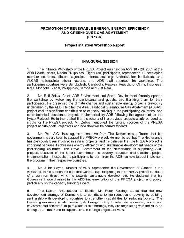 The Initiation Workshop of the PREGA Project was held on April 18 - 20, 2001 at the ADB Headquarters, Manila Philippines. Eighty (80) participants, representing 10 developing member countries, bilateral agencies, international organizations/other institutions, and ALGAS national/international experts, and ADB staff attended the workshop. The participating countries were Bangladesh, Cambodia, People's Republic of China, Indonesia, India, Mongolia, Nepal, Philippines, Samoa and Viet Nam.
