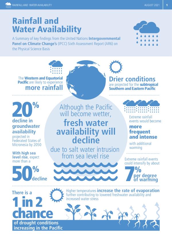 A summary of key findings from the United Nations Intergovernmental Panel of Climate change' (IPCC) 6th assessment report (AR6) on the Physical science basis. Although the Pacific may generally become wetter as the planet warms, fresh water availability could decline in many areas due to salt water intrusion resulting from sea level rise