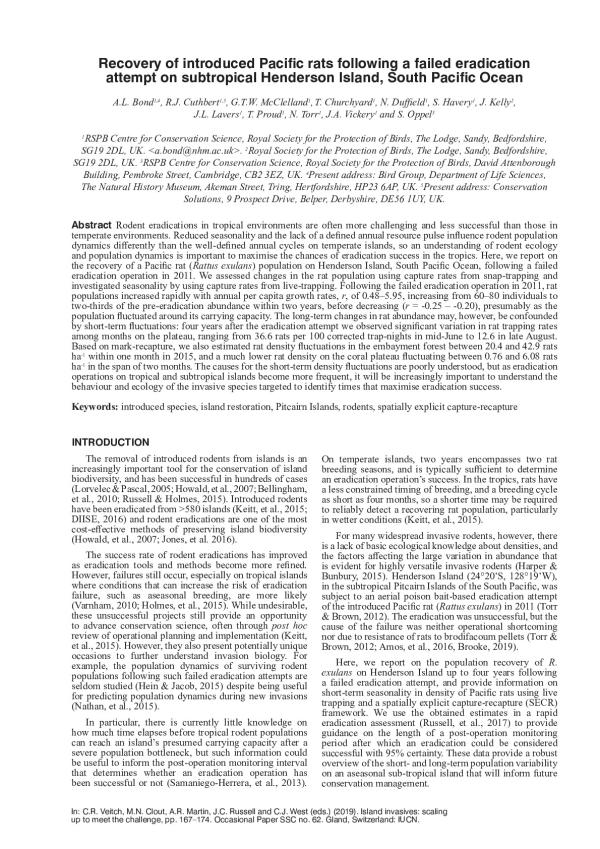 Rodent eradications in tropical environments are often more challenging and less successful than those in temperate environments. Reduced seasonality and the lack of a defined annual resource pulse influence rodent population dynamics differently than the well-defined annual cycles on temperate islands, so an understanding of rodent ecology and population dynamics is important to maximise the chances of eradication success in the tropics. Here, we report on the recovery of a Pacific rat (Rattus exulans) population on Henderson Island, South Pacific Ocean, following a failed eradication operation in 2011. We assessed changes in the rat population using capture rates from snap-trapping and investigated seasonality by using capture rates from live-trapping. Following the failed eradication operation in 2011, rat populations increased rapidly with annual per capita growth rates, r, of 0.485.95, increasing from 6080 individuals to two-thirds of the pre-eradication abundance within two years, before decreasing (r = -0.25 -0.20), presumably as the population fluctuated around its carrying capacity. The long-term changes in rat abundance may, however, be confounded by short-term fluctuations: four years after the eradication attempt we observed significant variation in rat trapping rates among months on the plateau, ranging from 36.6 rats per 100 corrected trap-nights in mid-June to 12.6 in late August. Based on mark-recapture, we also estimated rat density fluctuations in the embayment forest between 20.4 and 42.9 rats ha-1 within one month in 2015, and a much lower rat density on the coral plateau fluctuating between 0.76 and 6.08 rats ha-1 in the span of two months. The causes for the short-term density fluctuations are poorly understood, but as eradication operations on tropical and subtropical islands become more frequent, it will be increasingly important to understand the behaviour and ecology of the invasive species targeted to identify times that maximise eradication success.
