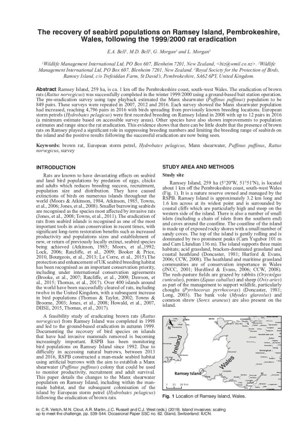 Ramsey Island, 259 ha, is ca. 1 km off the Pembrokeshire coast, south-west Wales. The eradication of brown rats (Rattus norvegicus) was successfully completed in the winter 1999/2000 using a ground-based bait station operation. The pre-eradication survey using tape playback estimated the Manx shearwater (Puffinus puffinus) population to be 849 pairs. These surveys were repeated in 2007, 2012 and 2016. Each survey showed the Manx shearwater population had increased, reaching 4,796 pairs in 2016 with birds spreading from previously known breeding locations. European storm petrels (Hydrobates pelagicus) were ?rst recorded breeding on Ramsey Island in 2008 with up to 12 pairs in 2016 (a minimum estimate based on accessible survey areas). Other species have also shown improvements to population estimates and range since the rat eradication. This evidence shows that there can be little doubt that the presence of brown rats on Ramsey played a signi?cant role in suppressing breeding numbers and limiting the breeding range of seabirds on the island and the positive results following the successful eradication are now being seen.
