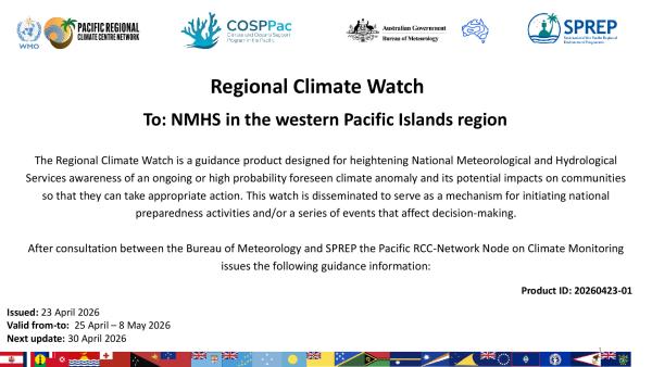 The Regional Climate Watch is a guidance product designed for heightening National Meteorological and Hydrological Services awareness of an ongoing or high probability foreseen climate anomaly and its potential impacts on communities so that they can take appropriate action. This watch is disseminated to serve as a mechanism for initiating national preparedness activities and/or a series of events that affect decision-making.