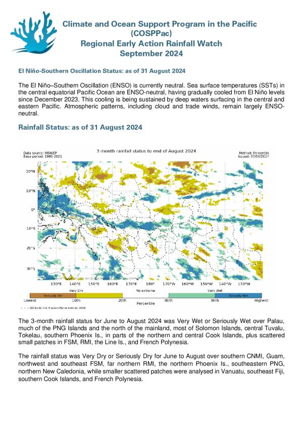 The 3-month rainfall status for June to August 2024 was Very Wet or Seriously Wet over Palau, much of the PNG Islands and the north of the mainland, most of Solomon Islands, central Tuvalu, Tokelau, southern Phoenix Is., in parts of the northern and central Cook Islands, plus scattered small patches in FSM, RMI, the Line Is., and French Polynesia.