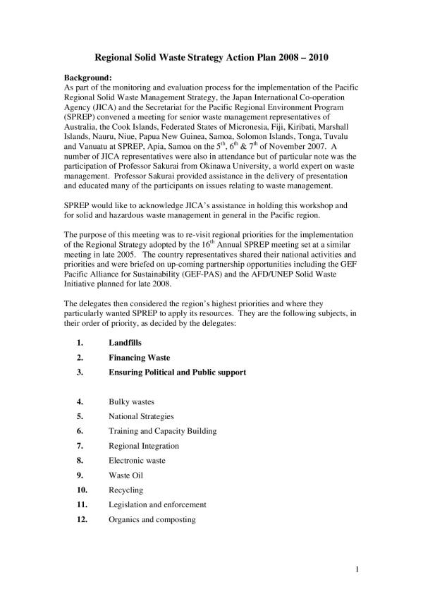 As part of the monitoring and evaluation process for the implementation of the Pacific Regional Solid Waste Management Strategy, the Japan International Co-operation Agency (JICA) and the Secretariat for the Pacific Regional Environment Program (SPREP) convened a meeting for senior waste management representatives of Australia, the Cook Islands, Federated States of Micronesia, Fiji, Kiribati, Marshall Islands, Nauru, Niue, Papua New Guinea, Samoa, Solomon Islands, Tonga, Tuvalu and Vanuatu at SPREP, Apia, Samoa on the 5th, 6th & 7th of November 2007. A number of JICA representatives were also in attendance but of particular note was the participation of Professor Sakurai from Okinawa University, a world expert on waste management. Professor Sakurai provided assistance in the delivery of presentation and educated many of the participants on issues relating to waste management.
