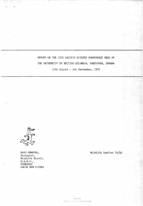 The 13th Pacific Science Congress was held recently during 15th August and 1st September 1975 in Vancouver, Canada. The theme of the Congress was "Man's Future in the Pacific". Nearly all the Pacific countries were represented and about 2000 people attended the congress. The countries and islands or states involved in the congress were as followes Canada, U.S.A. (most states), India, U.S.S.R., Indonesia, China, Japan, Singapore, Kuala Lumpur, Australia, Papua New Guinea, New Zealand, Hawaii, New Caledonia, Fiji, Cook Islands, American Samoa, Africa, Rome, England, Germany, France, Bangkok, Hong Kong, etc.