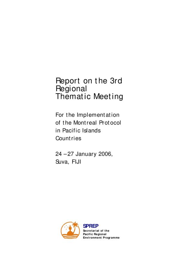 The 3rd Thematic Meeting for the Implementation of the Montreal Protocol was held from 24-27 January 2006 at the New Southern Cross Hotel, Suva, Fiji. The workshop was attended by representatives from the Governments of the Cook Islands. Federated States of Micronesia (FSM), Fiji, Kiribati, Marshall Islands, Nauru, Nine. Papua New Guinea (PNG), Palau, Samoa,Tonga, and Tuvalu. An observer from the Government of New Caledonia also took part in the meeting.